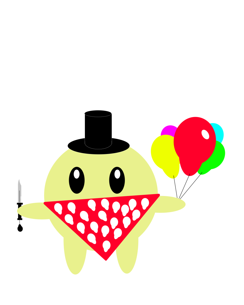 This character was simple to design and took very little adjustment as I started off this task with an idea in mind, I then used photoshop to recreate my idea as best I could, the main noticeable changes are that I added more to the design of the bandana, I added a knife to the character’s hand and I also gave him a top hat, I did these because for a bandit the character did not look as if they were a thief so I added a knife, however the knife did not fit with the rest of the piece, so to try and make it look more connected I added a balloon keychain, for the design on the bandana I added more balloons because they were oddly spaced and the empty space in the middle looked too plain, I gave him a top hat as I felt that the top of his head looked too plain.
